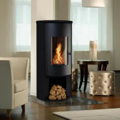 Der Gussofen Dovre Bold 400 überzeugt mit seinem modernen, zylinderförmigen Design. Der Korpus aus hochwertigem Gusseisen bringt alle Vorteile des massiven Materials in Ihren Wohnraum. Mit einer Nennwärmeleistung von 7 kW beheizt er kleine bis mittelgroße Aufstellräume mit einem Raumvolumen von bis zu 140 m³ zuverlässig und gleichmäßig. Dank eines Wirkungsgrads von 80 % schont er dabei nicht nur die Umwelt, sondern hält auch die Heizkosten für Sie gering.