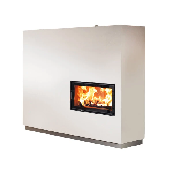 Der Designer-Kamin Austroflamm Miu Xtra ist durch seine minimalistische Gestaltung und sein ungewöhnliches Format in der Platzierung im Raum so vielseitig wie seine Heiztechnik. Der Korpus ist rechteckig konzipiert und macht den Miu Xtra mit seinen Maßen von 1,62 m in der Höhe sowie 1,82 m in der Breite zu einem Statement im Raum. Durch seine dabei recht geringe Tiefe von nur 51,1 cm lässt er sich dennoch unaufdringlich direkt an der Wand platzieren oder aber auch als Raumteiler der besonderen Art einsetzen. Die geschlossene Fläche des Korpus wird lediglich durch die großzügige, schwarz umrahmte Sichtscheibe und eine freitragende Bank aufgebrochen. So liegt der Fokus ganz auf dem Kaminfeuer. Insbesondere die optional erhältliche 1,55 m lange Bank wertet den Miu Xtra optisch auf: Sie läuft direkt unter dem Sichtfenster entlang und wird sogar um die Ecke geführt. An der Stirnseite des Miu Xtra ist sie nochmals 76 cm lang. Mit der Struktur von Douglasienholz wird die Oberfläche der Bank veredelt und sie bildet somit einen gelungenen Kontrast zur blanken Oberfläche des Korpus.