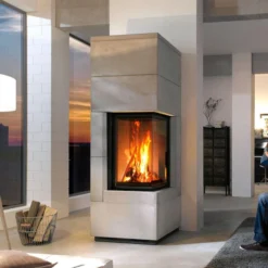 Die Grundfläche misst bescheidene 60 x 60 cm. Somit ist der rechteckige Kamin mit quadratischem Stand sowohl für geräumige Lofts als auch für kleinere Räumlichkeiten bestens geeignet. Besonders platzsparend ist die Aufstellung als Eckkamin.