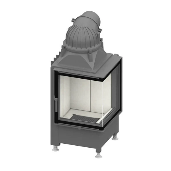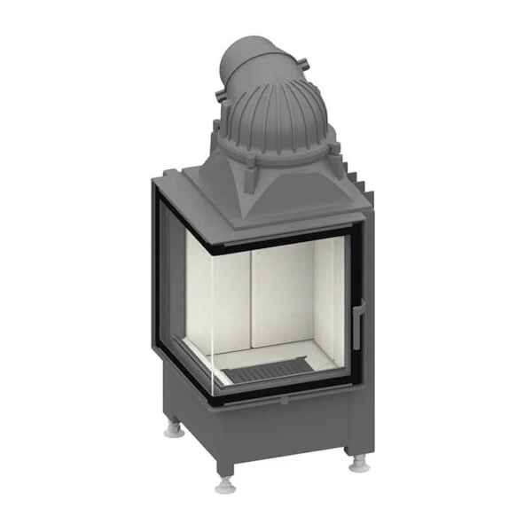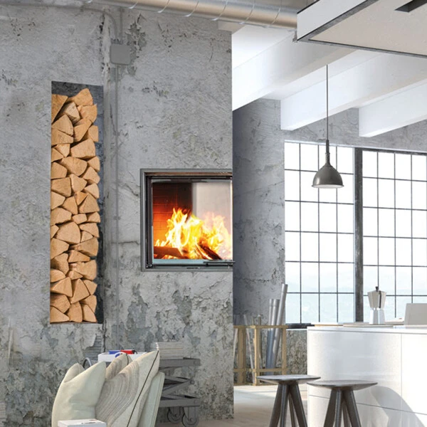 Doch Schmid wäre nicht Schmid, wenn die Optik nicht eine wichtige Rolle beim Ekko 45 spielen würde. Dieser hat eine eckige Front und die Sichtscheibe aus einteiligem Glas in Kristall-Optik ist um 90° abgewinkelt. Somit hat man von zwei Seiten freien Blick auf das Feuer. Eine Auswahlmöglichkeit bietet die Innenverkleidung. Die Standardvariante ist die glatte weiße Schamotteverkleidung, wer es etwas robuster mag, wählt die anthrazitfarbene Variante. Aber auch verschiedene Blendrahmenausfertigungen können das Äußere dieses Kamineinsatzes bereichern.